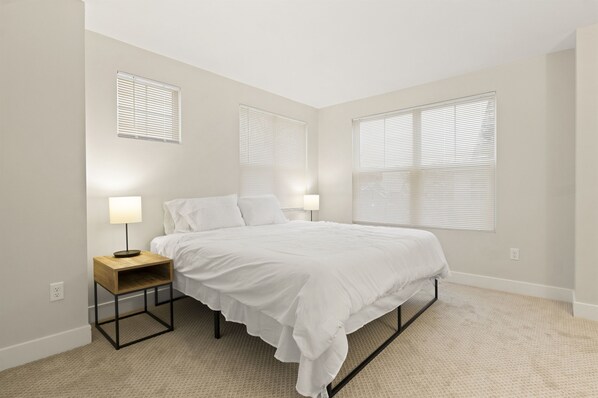 Indulge in the tranquility of our bedrooms, each adorned with plush mattresses for the ultimate night's sleep. Bask in natural light and revel in ample storage. The master bedroom boasts a regal king-size bed, while the second bedroom offers a cozy queen-size escape. The full bathroom, equipped with a stand-up shower and bathtub, ensures your every comfort. A convenient half bathroom graces the first floor, enhancing your stay.