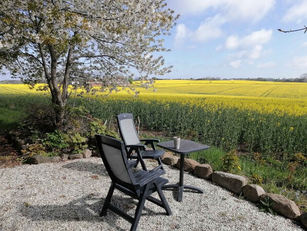 The large terrace by the courtyard is ideal for shared meals and barbecue evenings with views of open fields. The house is elevated and offers beautiful sunrises and sunsets in peaceful surroundings, where tranquillity is a natural part of your stay.