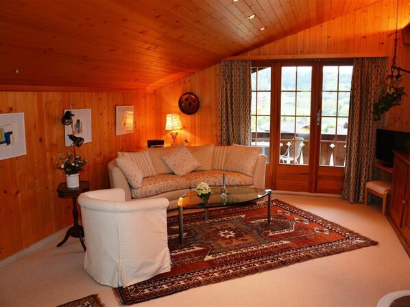 Rustical furnished 3.5 apartment. Living room with chimney, radio/TV (cable) and telephone. WiFi. 1 bedroom with a double bed (2x90x200cm), 1 bathroom with bathtub/toilet and direct access to the bedroom and the living room. Open-plan kitchen with dining area, equipped with oven, dishwasher, refrigerator with freezer, pad-coffee machine (Tassimo), filter coffee machine, fondue-raclette set.