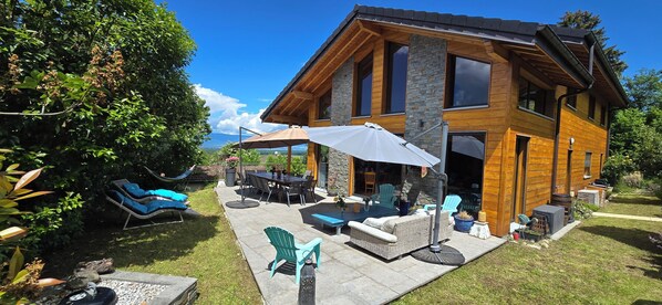 Wooden house between lake and mountains with indoor pool