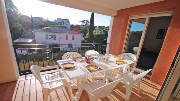 - Sala de estar con sofá, TV de pantalla plana, comedor, caja fuerte y acceso a la terraza.