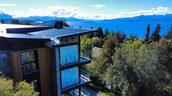 Mi deseo es que puedas conectar, contemplar el presente desde este espacio donde se pensó cada detalle.. sus atardeceres son inolvidables, el balcón te invita a vivenciarlo. Este departamento te permite tener la sensación de estar adentro pero plenamente conectado con el afuera, el paisaje, la naturaleza. La habitación está decorada con un antiguo muelle del lago, que junto a los azules se mimetiza con el entorno. Y las madera del living, los cuadros de artistas locales todo está pensado que que tengas una auténtica experiencia Patagonico. Te esperamos