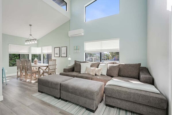 Additional features include mini-split AC, high-speed WiFi, an in-home washer/dryer, and a two-car garage stocked with beach gear. Whether you're relaxing indoors or grilling outside after a beach day, this home sets the stage for unforgettable memories.