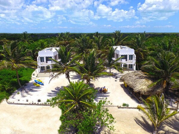 Playa del Sol impresiona desde el momento en que atracas en el muelle y entras en los exuberantes jardines, pero su mayor atractivo es que está a solo 800 yardas del arrecife. La arquitectura única, que combina el encanto tropical, la sofisticación mediterránea y la artesanía beliceña, está diseñada para fusionar la vida interior y exterior en una experiencia perfecta. En el interior, la casa de huéspedes es amplia y luminosa, con techos altos, grandes ventanales y una sala de estar y comedor de planta abierta. Todas las habitaciones tienen ventiladores de techo y aire acondicionado. Una cocina de vanguardia hace que cocinar sea un placer con electrodomésticos de alta gama. En nuestro resort boutique, ofrecemos unas vacaciones relajantes y llenas de tranquilidad. Comience el día viendo un increíble amanecer en el muelle y luego salte al agua cristalina. Usa nuestros kayaks o tablas de pedales para remar hasta el arrecife. Disfruta de la piscina, descubre la costa en bicicleta. Nuestra jungla es el hogar de iguanas, colibríes y águilas pescadoras. Pasa el rato en nuestro bar tiki y disfruta de bebidas exóticas y comida local para el alma o toma una siesta en nuestro muelle privado. Estarás rodeado de cientos de cocoteros. Durante el día verás aves exóticas cazando en el agua plana. Puedes pescar pargos, sábanas y barracudas desde el muelle durante la tarde.