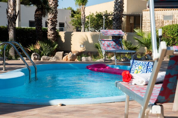 La Villa Minoa es una estructura muy cómoda para familias y grupos de hasta 9 u 11 personas que deseen aprovechar la dependencia. La piscina exterior le permitirá pasar momentos de absoluta tranquilidad y relajación. El interior de la villa está equipado con tres aparatos de aire acondicionado: uno en el salón y otro en cada dormitorio. El cuarto de baño es muy grande y espacioso, con todas las comodidades y ducha. Los dos dormitorios dobles están equipados con cama portátil adicional, pero si es necesario podemos proporcionar camas supletorias en la dependencia o sala de estar. La propiedad tiene 3 cuartos de baño (como en las fotos) 2 dentro de la propiedad, 1 fuera + 1 ducha exterior.