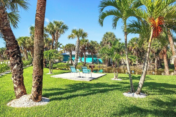 Enjoy all that Sanibel Island has to offer at the West End Paradise. Our charming cottage style accommodations offer a serene and tropical setting with mature foliage, pond with birds and turtles and we're just a short walk to the private Tradewinds beach. Unit "Fish 6" is a bungalow style suite with a full kitchen, spacious living room, dining area, screened lanai and separate bedroom with a queen sized bed. There is a full bathroom in the suite as well. Need more room? ... add unit "Sanddollar 7" for an additional bedroom with king sized bed and full bathroom. All of our units come with beach towels, access to the charcoal bbq grill, outdoor seating, high speed wireless internet, cable TV and air conditioning for those tropical Island summers. Only one parking space per unit.