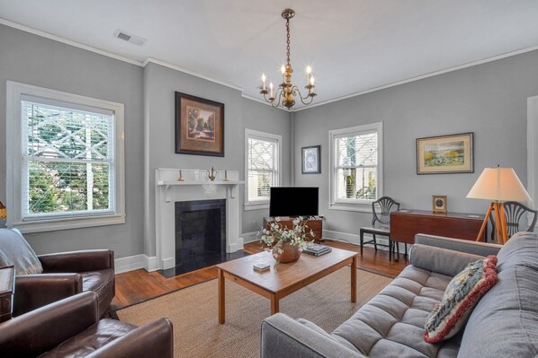 Un conjunto de pasos lo llevará a esta cochera de segundo nivel, situada a solo una cuadra de la famosa Fuente en Forsyth Park. La sala de estar le permite asientos amplios a medida que se regala en las aventuras del día. El sofá de la sala de estar puede acomodarse en una cama Queen para acomodar a dos personas adicionales.