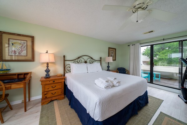 Hay dos dormitorios y dos baños en esta casa adosada. A los niños les encantará la habitación del primer piso, que cuenta con una cama queen y una cama de día. Los deslizadores conducen al porche cubierto y hay un baño en la sala con una bañera / ducha. Tome la escalera abierta a la suite principal del segundo piso. La habitación tiene una cama king, gran televisor de alta definición en el armario y dos terrazas para tomar el sol. El baño principal actualizado tiene un área de lavamanos separada y un amplio vestidor. La zona de baño tiene bañera / ducha.