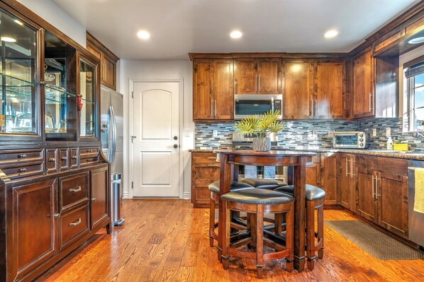 Inside the fully updated home, elegant décor and furnishings complement the beautiful wood flooring flowing through each room. The living room includes plush leather sofa and recliner seating with a smart TV, enabling you to relax and unwind in your downtime while streaming your favorite movie. The open floorplan naturally carries you into the modern, fully equipped kitchen showcasing stainless steel appliances, warm wood cabinets, and granite countertops. You’ll love spending time here creating delicious meals or playing a round of cards seated at the high-top dining table with stools for 4. Drip and single serve coffee makers are on hand to assist with your morning wakeup, and back outdoors there are plenty of places to enjoy it.
