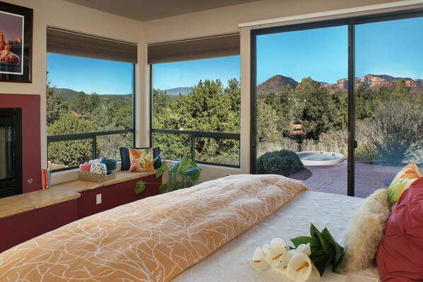 The Master Suite - sits on the west side of the home and is very spacious. It has sweeping forest views from floor-to-ceiling walls of glass - from Bear Mountain in the north, to Mingus Mountain to the Southwest, and everything in-between. The room has a King Bed, with 3" memory foam gel topper; luxurious bedding, a fireplace; walk-in closet, separate walkout to the hot tub, large private bath and separate temperature controls from the main home. The bath has a dual sink and cabinets; granite counters; private water closet. Relax in the large soaking tub with 3 sided window views and bottom-up privacy blinds, light fixtures, and candles. The lighted walk-in shower has dual shower heads with individual water temperature controls.