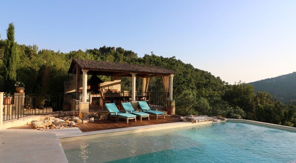 En el exterior, gozaréis de preciosas vistas a las colinas del Var. Relajaos en las terrazas, perfectas para descansar o comer al aire libre en el pool-house con gran mesa para 10 personas, pequeño salón y zona de cocina con barbacoa. La piscina privada climatizada con 3 niveles permite nadar incluso fuera de temporada.