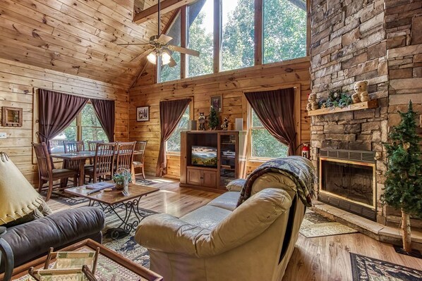 Esta unidad de 3 dormitorios y 3 baños con capacidad para 8 personas tiene 3 niveles. Esta hermosa cabaña de madera ofrece techos altos abovedados y ventanas. Hay 6 escalones para llegar a la cabaña y hermosas vistas de las montañas que lo rodean. En el nivel principal, encontrará una cocina totalmente equipada con comedor para 6 personas, una sala de estar con sofá cama doble, sofá de dos plazas, chimenea de piedra a leña y un televisor con sonido envolvente. También hay una habitación queen con baño completo, que incluye una combinación de ducha / bañera. La cubierta del nivel principal contiene la bañera de hidromasaje, las mecedoras y un conjunto de patio con vista a las tranquilas vistas boscosas.