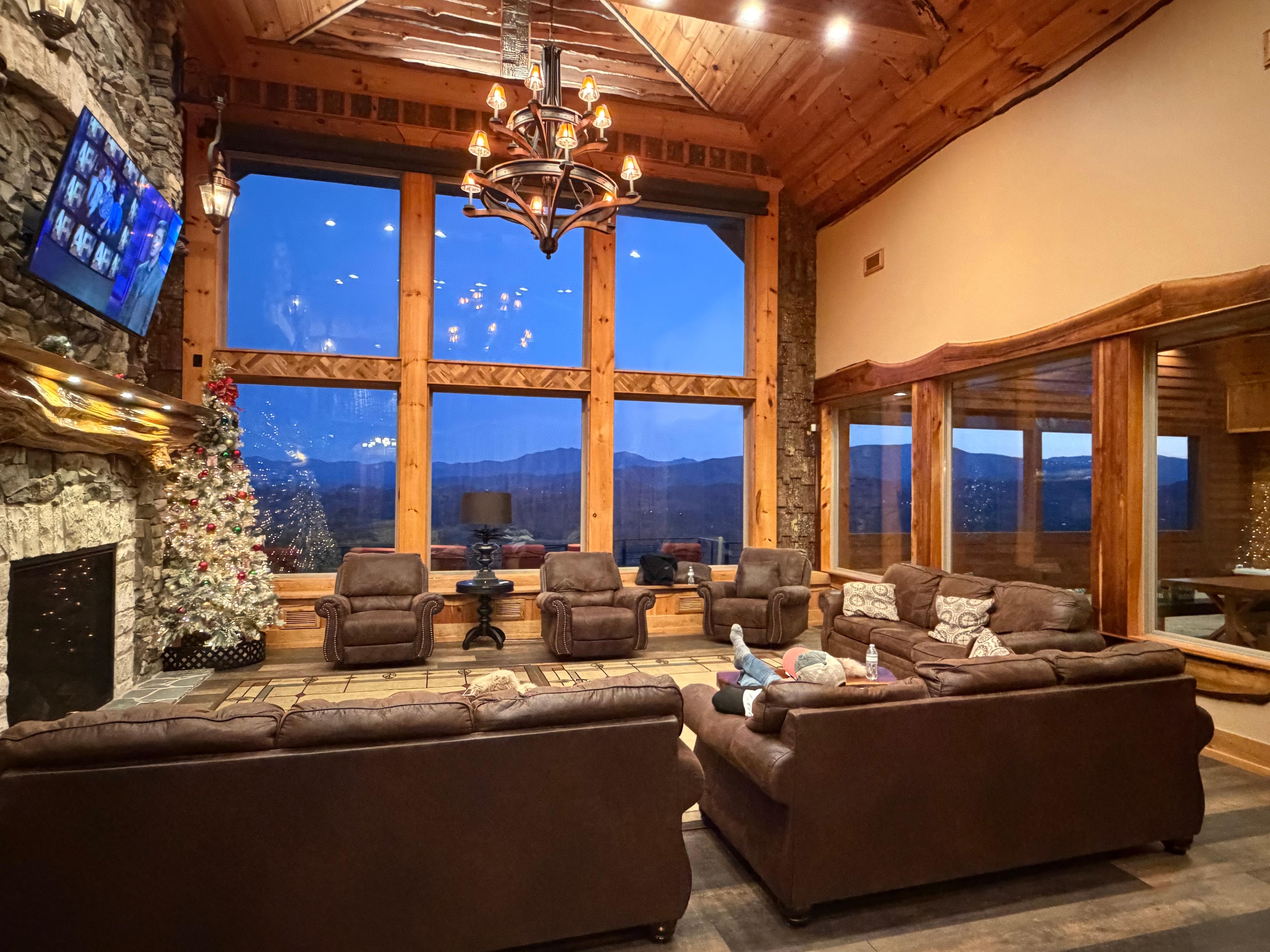 On the main entry level, you will find the great room with a 75-inch 4K TV and 3 separate seating areas. This space will provide plenty of room for your entire group to come together and relax in front of the fireplace.