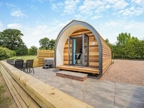 Shower Room: Cubicle Shower, Heated Towel Rail, Toilet. Electric central heating, electricity, bed linen, towels and Wi-Fi included. Welcome pack. Grounds with patio and garden furniture. Hot tub for 6 (private). Private parking for 1 car. No smoking.. Broomy Bank Pods are a collection of exceptional glamping pods that sit within a spectacular landscape in Nesscliffe.