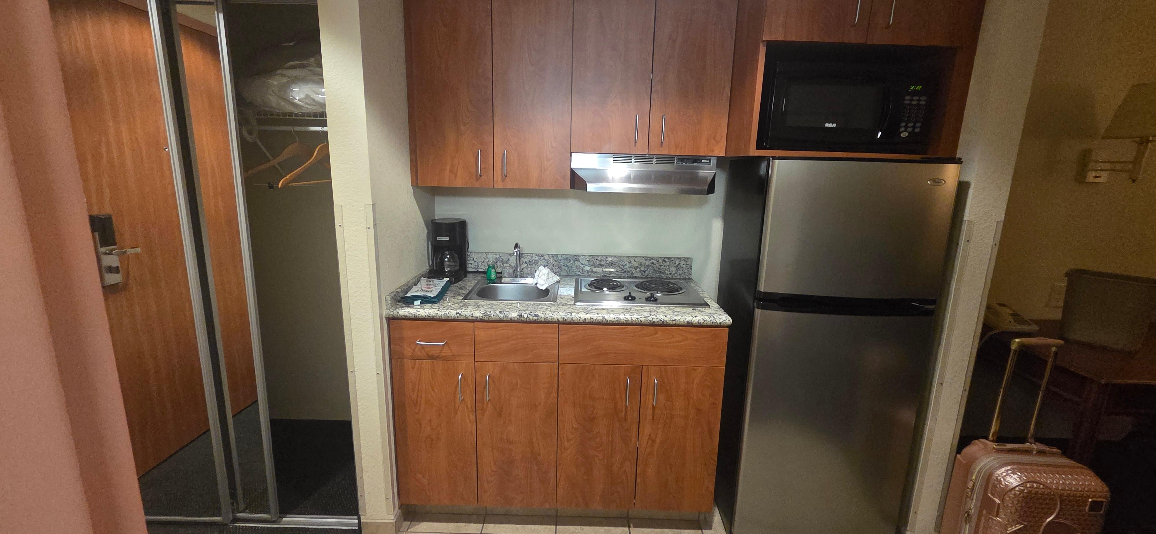 I can't say enough good things about this hotel! Every, single employee we came in contact with was ao friendly and helpful. The happy hour drinks and dinner were great, and the breakfast was even better! There was a little kitchenette with a fridge, microwave, a stove, and dishes, which was amazing! Parking was easy, beds were comfy. If I tried, I wouldn't be able to find one thing wrong during our 3 nights here! HIGHLY RECOMMEND!!!