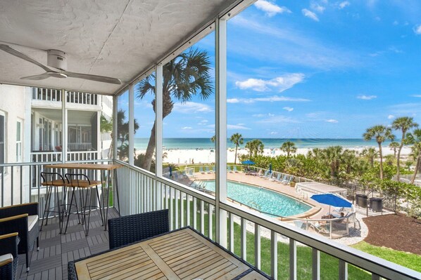 The relaxing color scheme of this beautifully renovated condominium sits front and center on the world-famous Crescent Beach on Siesta Key.
