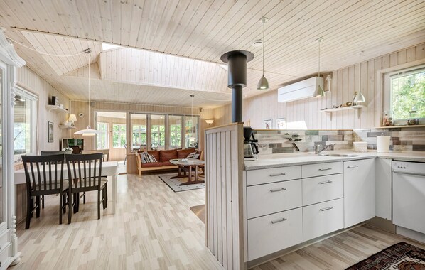 Entre en su acogedora casa de vacaciones y déjese inspirar por las acogedoras habitaciones amuebladas con gusto. Comience el día con un delicioso desayuno. La cocina americana le ofrece la oportunidad de preparar las comidas del día. Podrá relajarse en la confortable zona de estar, amueblada con un cómodo sofá y acogedores sillones, así como con una estufa de leña. Lean un libro, jueguen a juegos de mesa o vean una película juntos. El invernadero es otro punto fuerte de la casa, donde podrá disfrutar de las vistas al jardín incluso en los días más frescos. Relájese en la bañera de hidromasaje de la casa.
