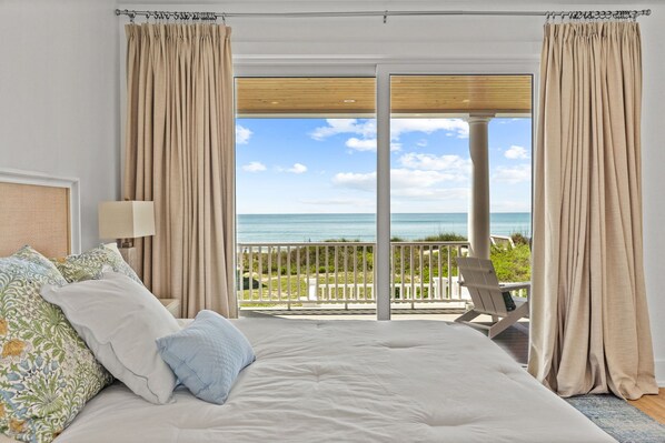 Proceed upstairs to the second floor and primary living area where you will be greeted by breathtaking ocean and marsh views in this open floor plan with vaulted ceilings. Immerse yourself in the spacious living areas where you’ll find tasteful accents and ample natural light. The living room has plenty of seating so you can enjoy a fun movie night or watch your favorite sporting event in comfort. The gourmet kitchen is equipped with top-of-the-line appliances, a gas range, and extras including both a Keurig and a coffeepot capable of accepting whole beans or ground. A spacious middle island offers seating for 5. The dining room table accommodates 10 and bathes the room in the glow of sunset each evening. Al fresco dining is available on the top floor oceanfront porch. A half bathroom resides on this floor, in addition to the private marsh lounge featuring another television and a queen sleeper sofa. The fourth bedroom, and only one on this floor, has a king-sized bed, an ensuite bathroom with spa shower, and beautiful sound views from the wall to wall windows.