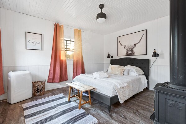 Queen bed. Smart tv. Rack and hangers for clothing. Gas fireplace. Ceiling fan. Luggage Rack.