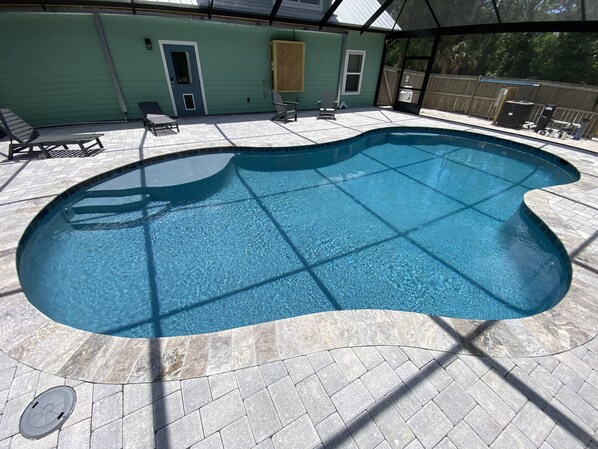 Fully fenced-in backyard, w/ upgraded EXPANDED VIEW screened-in SALTWATER pool. (~500sf of pool area & ~1100sf of paver deck area)