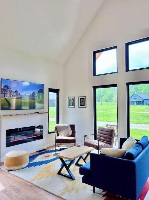 The kitchen is equipped with modern appliances, a table for dinner or games, or bar seating. Cozy up on the couch by the electric fireplace which adds touch of ambiance and glow to the living space, complemented by entertainment options on a smart TV.