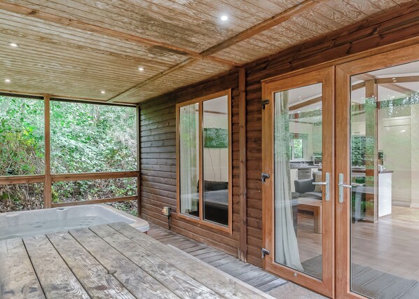 Timber clad lodge with one double with en suite shower and one twin (which can be linked to form queen size double – please request when booking). Bath with overhead shower. Covered outdoor hot tub.