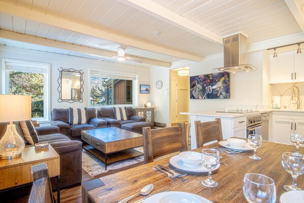 Atelier Allure envelops you in chic, yet homey interiors that strike the balance between style and comfort. The open living area features a brand-new, fully equipped kitchen and dining area for family-style meals, plush sofas for downtime, and a flat-screen TV for movie nights at home. Stepping out to the furnished deck, you'll be greeted by views of Proctor Mountain, creating the perfect backdrop for your morning coffee, evening glass of wine, or barbeque with friends. PLEASE NOTE: The BBQ is a summer amenity only!