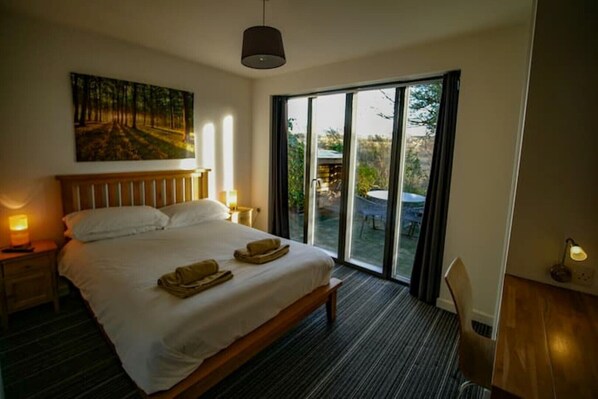 Separate double bedroom with wall to ceiling glazing.