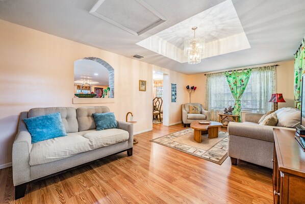 Caribbean style estate is large and designed for family & friends to enjoy and relax in while vacationing in the Tampa / Clearwater / St Pete community. Located across the street from Busch Garden's Adventure Island water park. You can walk to either park in minutes! This charming home has been completed remodeled, most everything is new from the roof to the hardwood floors. The furniture selection and floor plan design have all been well-thought-out to provide maximum relaxation. There are two master bedrooms, one of which has a full bath. Bathrooms are completely new and beautiful. Two bathrooms are important when gatherings are large. Home features a huge entertainment area surrounding the well-appointed kitchen. There are 3 flat-screen TVs; 50', & two 30' with soundbars. Cable TV and high-speed internet, Wi-Fi. There are 2 patios and a front porch with rocking chairs! Backyard is filled with tropical fruit trees; papaya, avocado, oranges, grapefruit, tangerines, 4 mango trees. All fenced in to give you seclusion and peace.