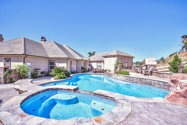 Salir a la parte posterior se encuentra una magnífica zona de entretenimiento al aire libre con agua de la roca impresionantes instalaciones de la piscina otoño. Nadar en la negociación de estar Piscina, 10 persona jacuzzi exterior con doble chorro / sopladores, la iluminación LED. Zona de barbacoa con bar y mesa de comedor y dos de madera natural chimenea encendida. ¡Tu oasis perfecto te espera y la convierte en una escapada perfecta!
