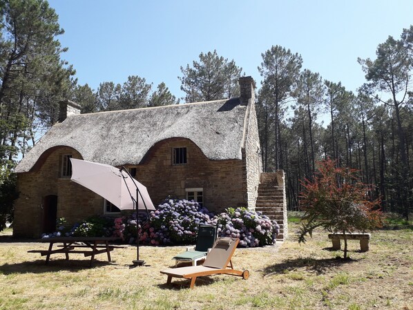 en el exterior ; muebles de jardín y tendedero, en el corazón de una propiedad sombreada de 8.8 hectáreas que consiste principalmente de pinos marítimos.