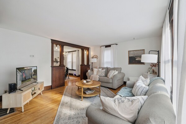 Enjoy the entire private home primely located in Uptown Maumee right in the center of all the action! This 1862 built house has charm for days. Enter using the electronic lock system. Original staircase, trim and hardwood floors great you. The 1st floor includes high ceilings and a separate living/dining area. The living room boasts 2 couches (one is a Queen mattress pull out), end tables, plenty of lamps & lights, coffee table and Smart TV w/ Sling TV provided (like basic cable) or you may use your own log in for other streaming apps.