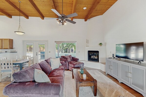 Inside, modern touches meet rustic charm with exposed ceilings, ample natural light, and plush furnishings. Highlights include a large kitchen, spacious rooms for gathering, and comfortable beds for plentiful rest in the evenings. After a full day exploring the city or lounging by the pool, come home to comfort and simplicity. Gather for movie nights, cook together in the well-appointed kitchen, and enjoy the beautiful surroundings.