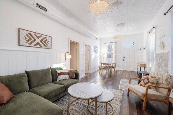 Step inside this historic home and you’re welcomed by a bright, airy space filled with natural light. Just past the entry, you’ll find a dining table, coat hooks, and a bench, with tall windows that open into the living area. The space features an electric fireplace set against mosaic tile, white shiplap walls, a large velvet couch, coffee tables, and a mounted 42" TV—perfect for relaxing, enjoying board games, or spending time together.