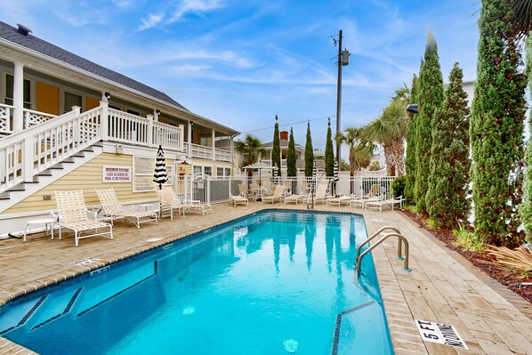 The Georgianna offers resort-style amenities, including a saltwater pool just down the hallway. Take a refreshing dip year-round or gather at the community patio area with a grill for a fun cookout. A serene sitting area by the pool adds an extra touch of coastal tranquility to your stay.