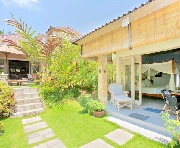 Se terminó el año pasado con los estándares occidentales con una estética balinesa, y fue construida en la planta baja de un antiguo campo de arroz. Tiene un estanque de peces y pequeña cascada, con su propio jardín, hamacas al aire libre, paraguas, una pequeña terraza con una mesa y 2 sillas, y otra silla cómoda para relajarse.