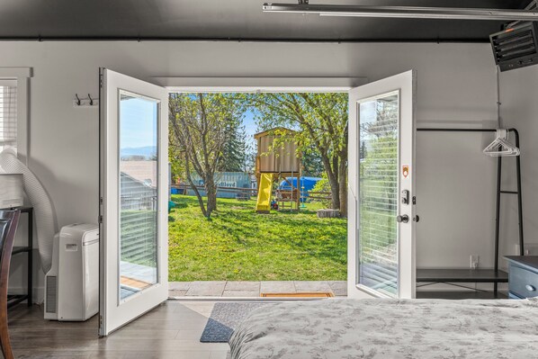 Please note: The original glass garage door shown in the photos has just been upgraded to a professionally finished wall, creating a cozier space with improved insulation and a refined look.