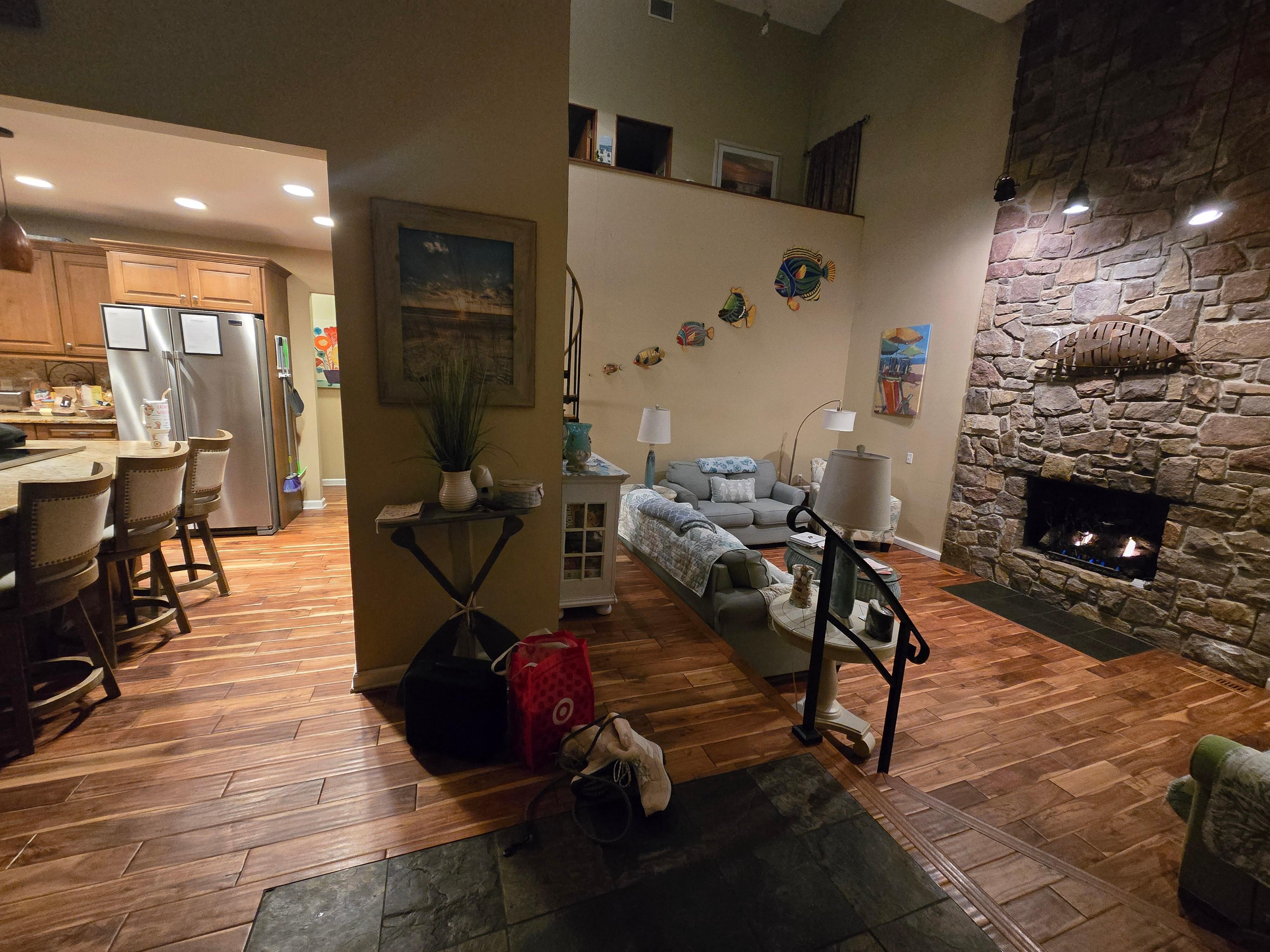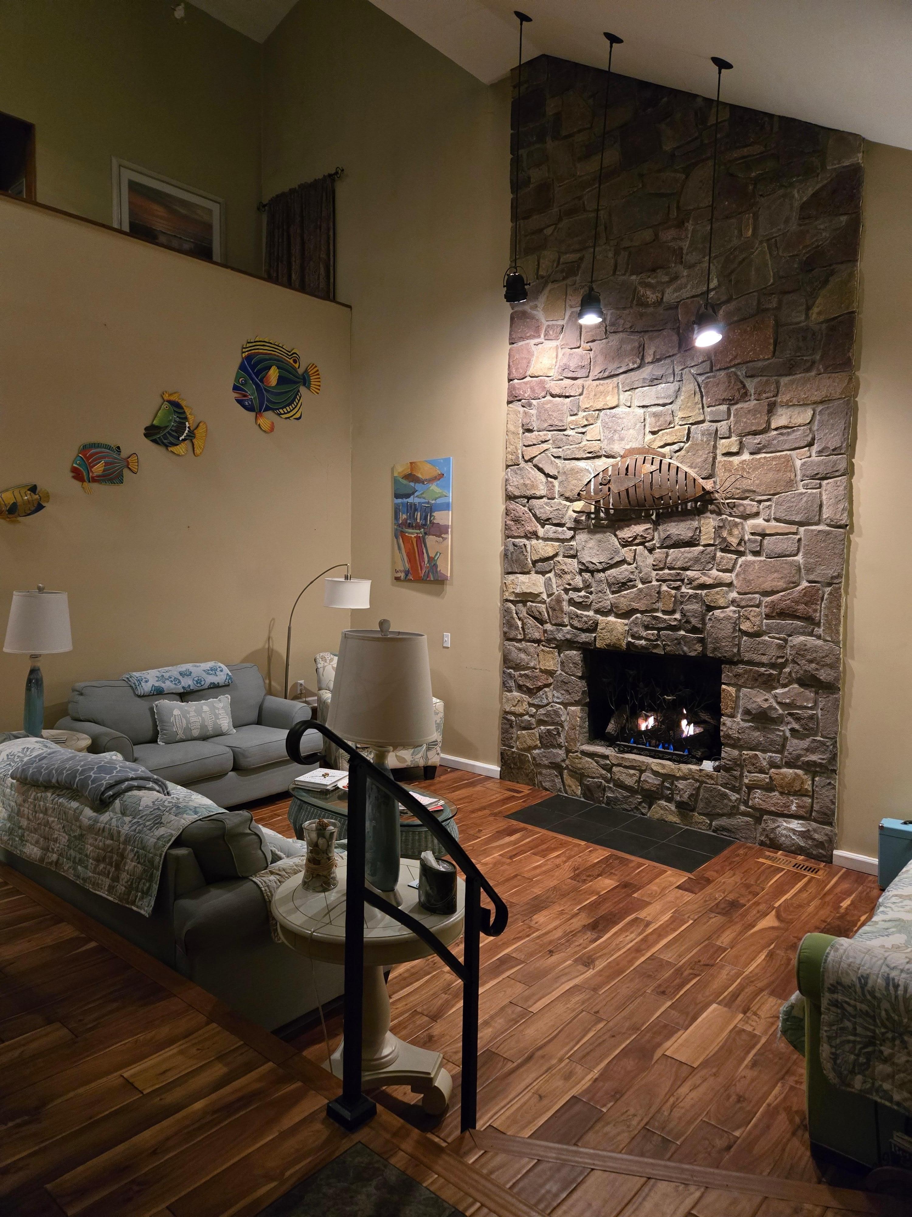 Arriba hay un baño completo, 2 dormitorios, altillo y área de entretenimiento, mientras que abajo tiene una hermosa suite principal, bañera de hidromasaje de gran tamaño, terraza acristalada y un dormitorio con dos camas. Perfecto para 1 o 2 familias. En esos días realmente calurosos, disfrute del aire central de 2 zonas, para las noches frescas hay 3 chimeneas de gas.