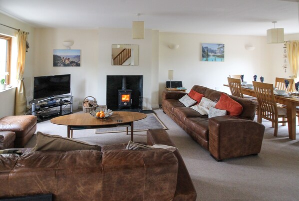 Un televisor inteligente vinculado a banda ancha, reproductor de DVD y sistema de radio DAB brindan entretenimiento.