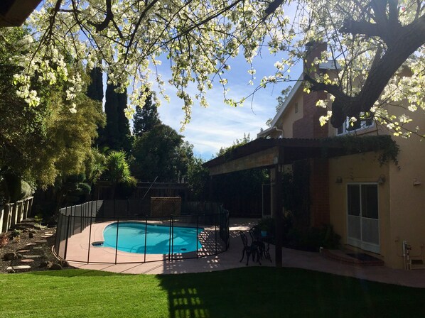 El gran patio trasero privado es un oasis frondoso totalmente ajardinado. Tiene una gran piscina calentada por energía solar encerrada dentro de vallas seguras. Hay una hermosa glorieta con muchos asientos para relajarse y disfrutar de la vista. El patio trasero también tiene un césped agradable y áreas pavimentadas para disfrutar.
