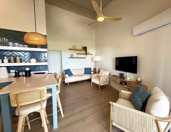 Los huéspedes también pueden disfrutar de conexión inalámbrica a internet gratuita, aire acondicionado, televisión de alta definición con cable y aparcamiento privado en el establecimiento. La terraza cuenta con una piscina comunitaria rodeada de jardines paisajísticos y está equipada con tumbonas, toallas y espacios exclusivos para comer al aire libre. Disfrute de este acogedor entorno para cenar al aire libre o tomar un cóctel por la noche mientras disfruta de las magníficas puestas de sol.