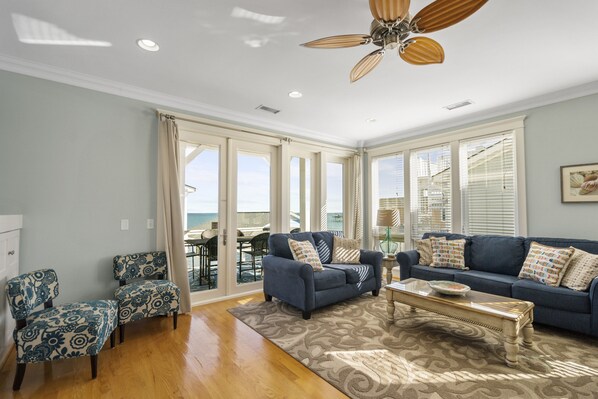 La sala de estar del piso superior ofrece amplias vistas del océano y el muelle de pesca. Las vistas nocturnas presentan aguas brillantes de las luces del muelle. Amaneceres y puestas de sol inspiradores desde las cubiertas del piso superior