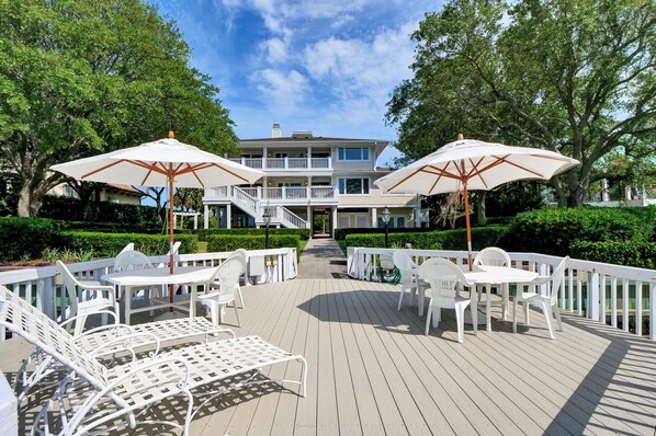 • Just beyond, you’ll find the dock with seating and 2 open boat slips (accommodating vessels up to 32 feet)—ideal for boating, crabbing, or simply watching the tide roll in.