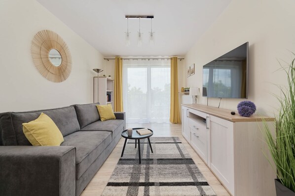 The interior is decorated in light shades. It is an excellent choice for anyone who appreciates comfort and functionality, but also aesthetics. The comfort of your stay is ensured by many amenities such as WiFi, a flat-screen TV and the necessary kitchen and bathroom equipment. The fully equipped kitchen offers all appliances for self-catering, such as an induction hob, oven, fridge, dishwasher and kettle. Guests also have access to a satellite TV and free Wi-Fi, as well as the necessary bathroom equipment (washing machine, hairdryer). Guests are provided with complimentary toiletries, towels and bed linen for a good start to their accommodation.