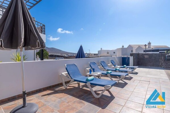 Terraza con orientación sur y una piscina privada climatizada. También hay asientos para hasta 6 personas para disfrutar de las tardes y de las barbacoas.