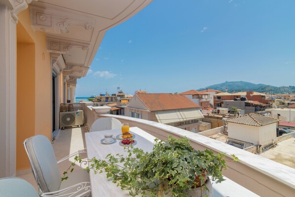 In the heart of Zakynthos town, this two-bedroom apartment, located on the 3rd floor of a beautiful neoclassical building, can accommodate up to 5 guests. The apartment consists of two bedrooms, each having a chest of drawers and a mirror, along with a closed-type wardrobe beside the comfortable double beds. There is an open-plan living room and kitchen area, as well as a bathroom with a walk-in shower cabin. The living room also has a convertible sofa bed that can accommodate an additional person. Marble is used on the floors, except in the bathroom, which features high-quality tiles. A spacious, furnished balcony offers views of the port on the left and the church of Saint Dionysios in the distance. The apartment provides easy access to all the attractions and amenities of Zakynthos town, making your stay convenient and enjoyable.