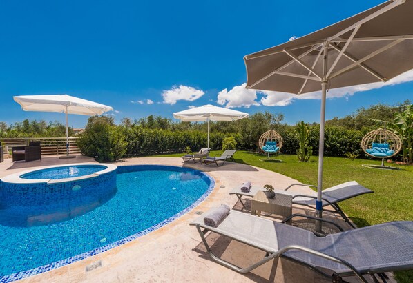 Piscina privada con forma de concha marina y en su centro una piscina más pequeña para niños (o para relajarse a su alrededor) Rodeada por el césped y toda la vegetación, con hamacas y sombrillas. Y una fantástica zona de barbacoa para disfrutar con la sombra del banano.