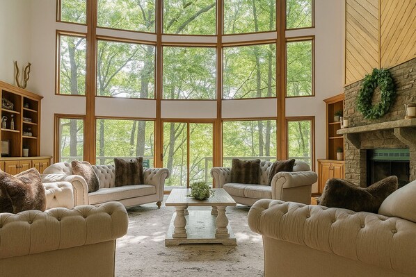 • Soaring 30-foot vaulted ceiling with picture windows offering forest views