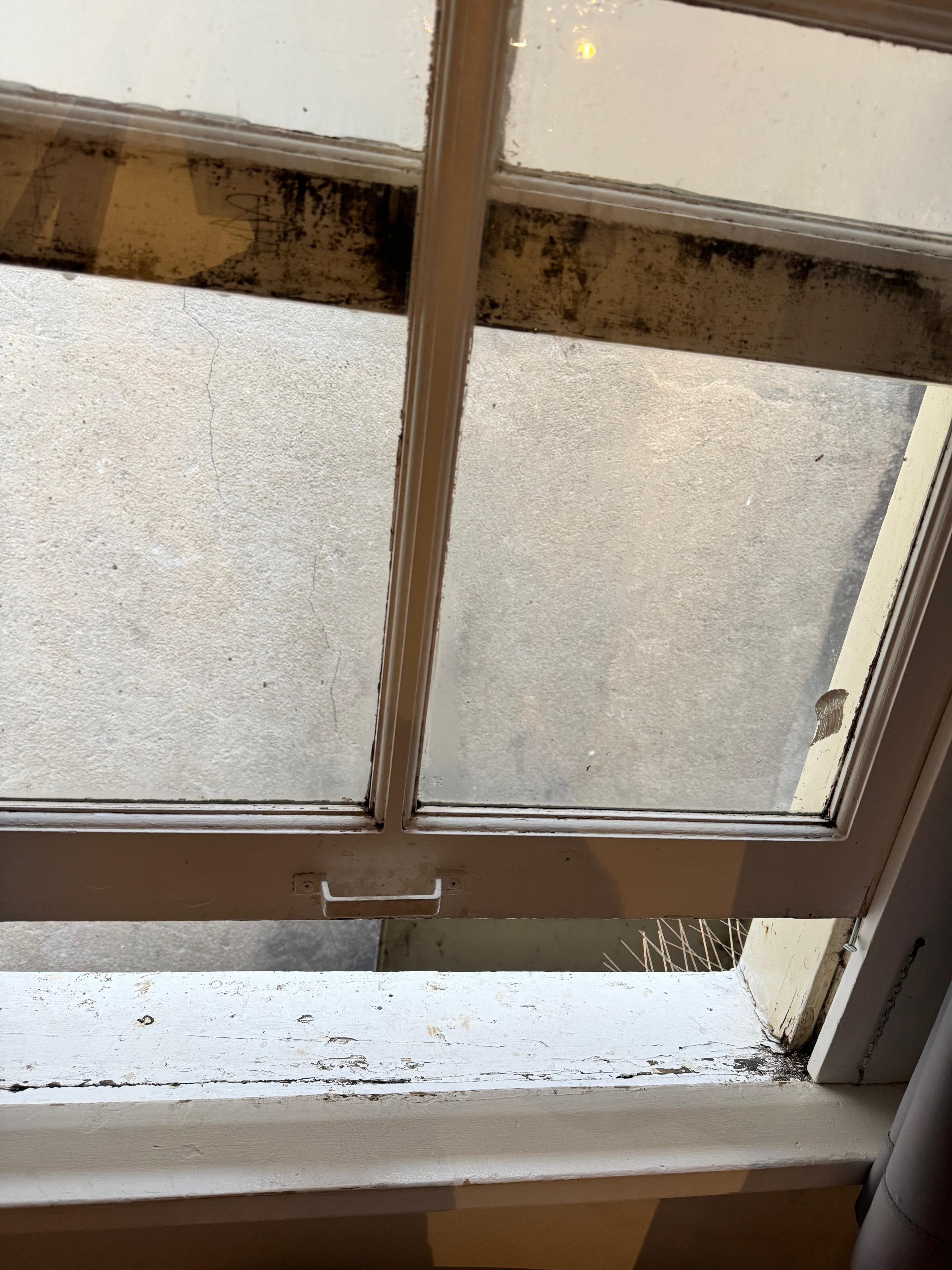 Filthy room, pigeons on window , black mould and smell from the bathroom