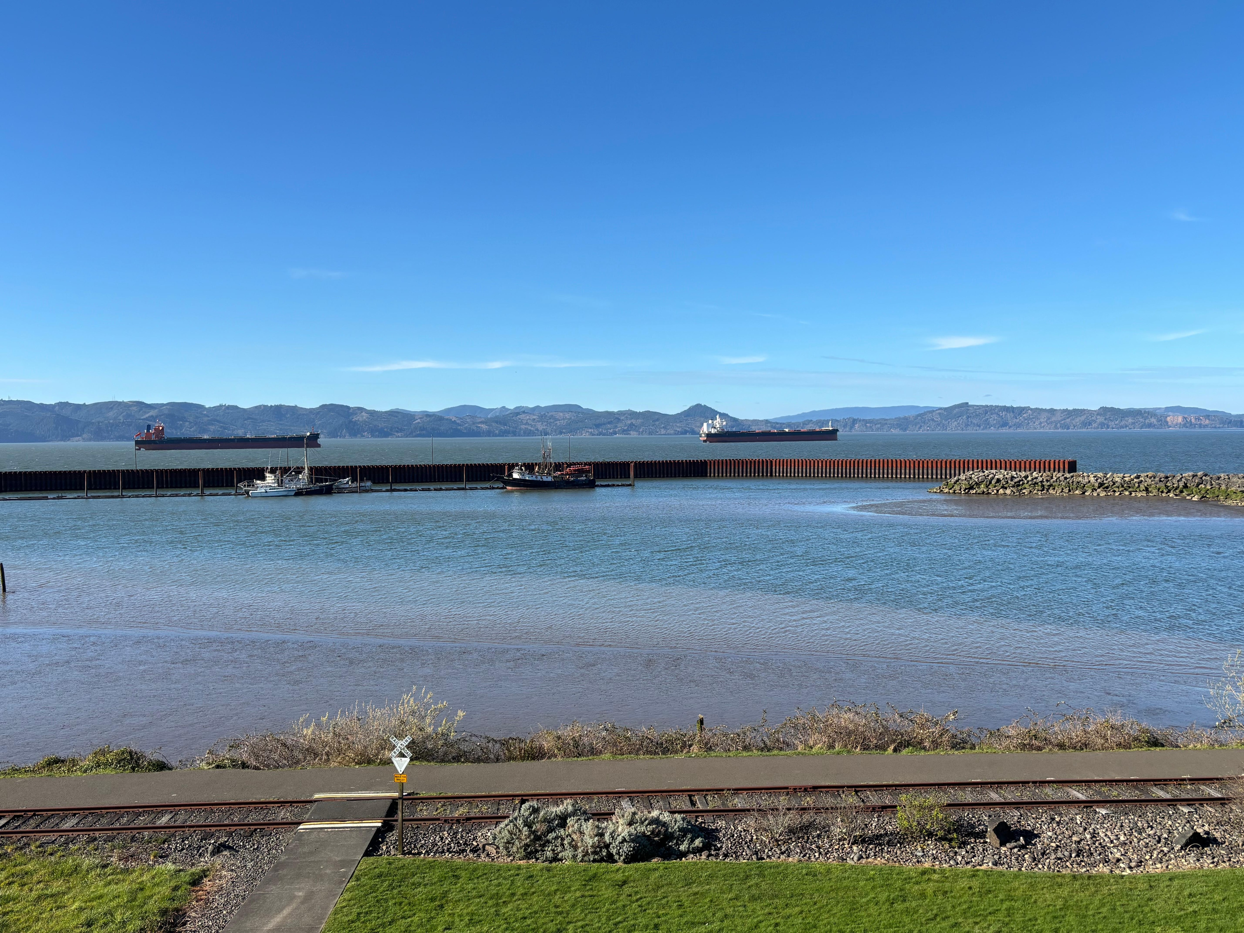 Dog friendly with very large grassy walkways and asphalt bike and walking trails along the waterway right here.This is a beautiful area of Astoria.
